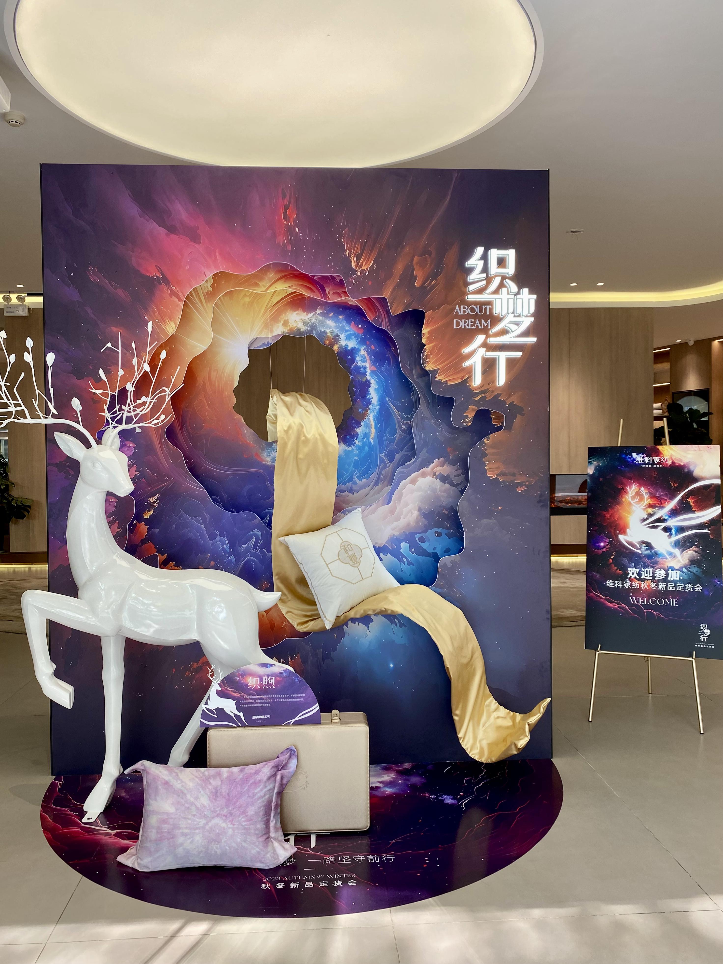 作為定貨場地的維科家紡總店,其陳列布置秉承“織夢行”主題,將夢幻元素與現代風格相融合,打造出一系列充滿想象力和溫暖的場地。
